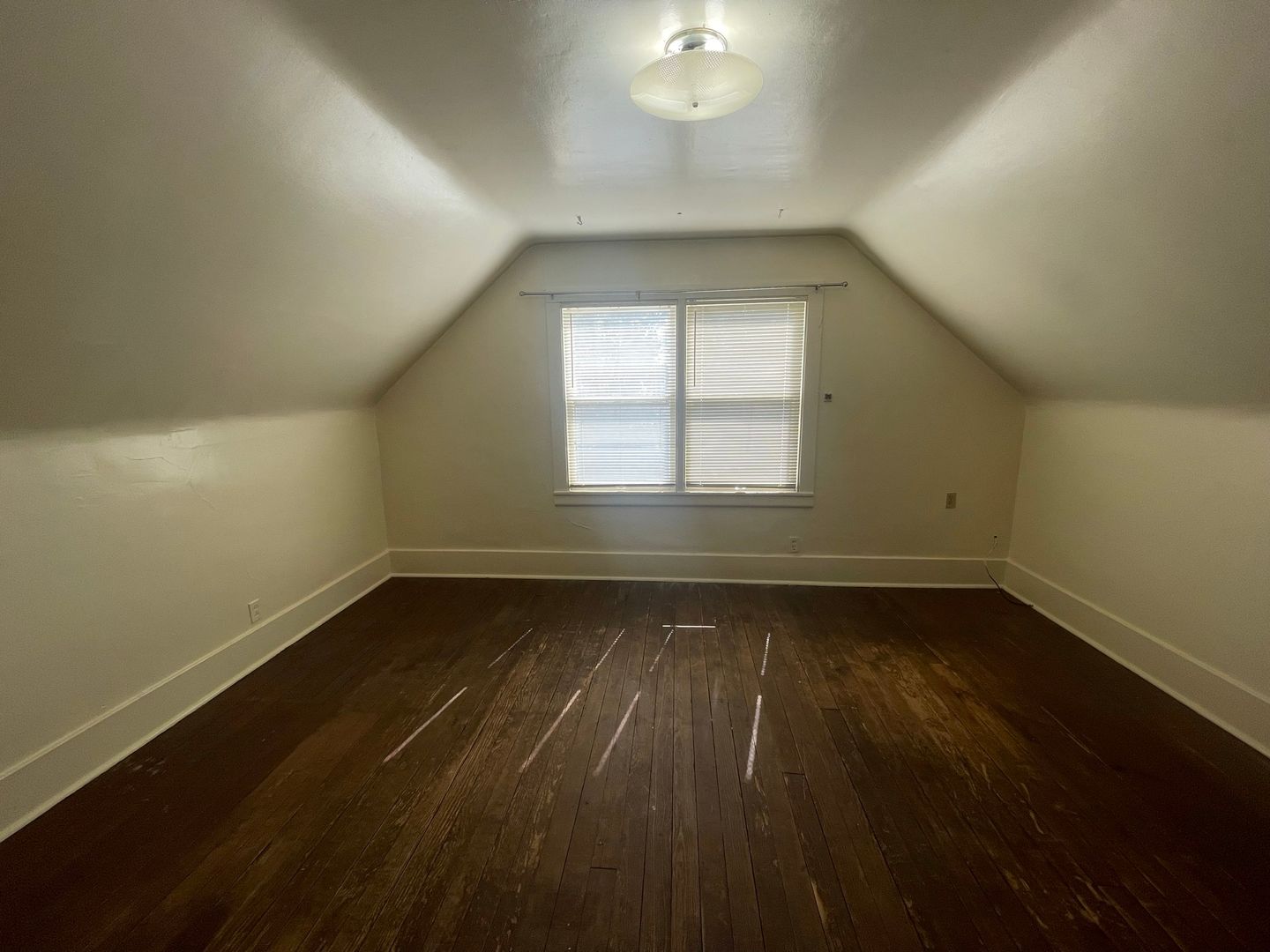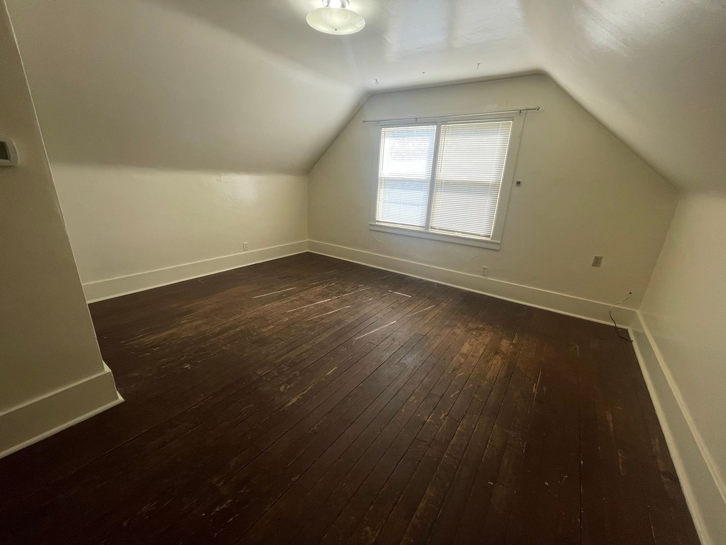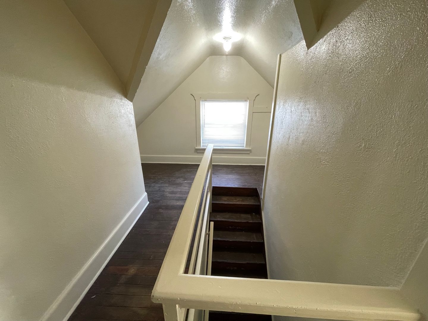 This unique, top floor studio apartment is on the top floor. It has rustic, dark wood flooring in the main room and stairwell landing.