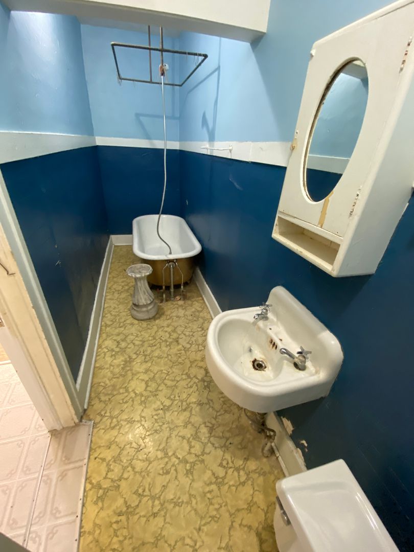 Green kitchen, blue bathroom